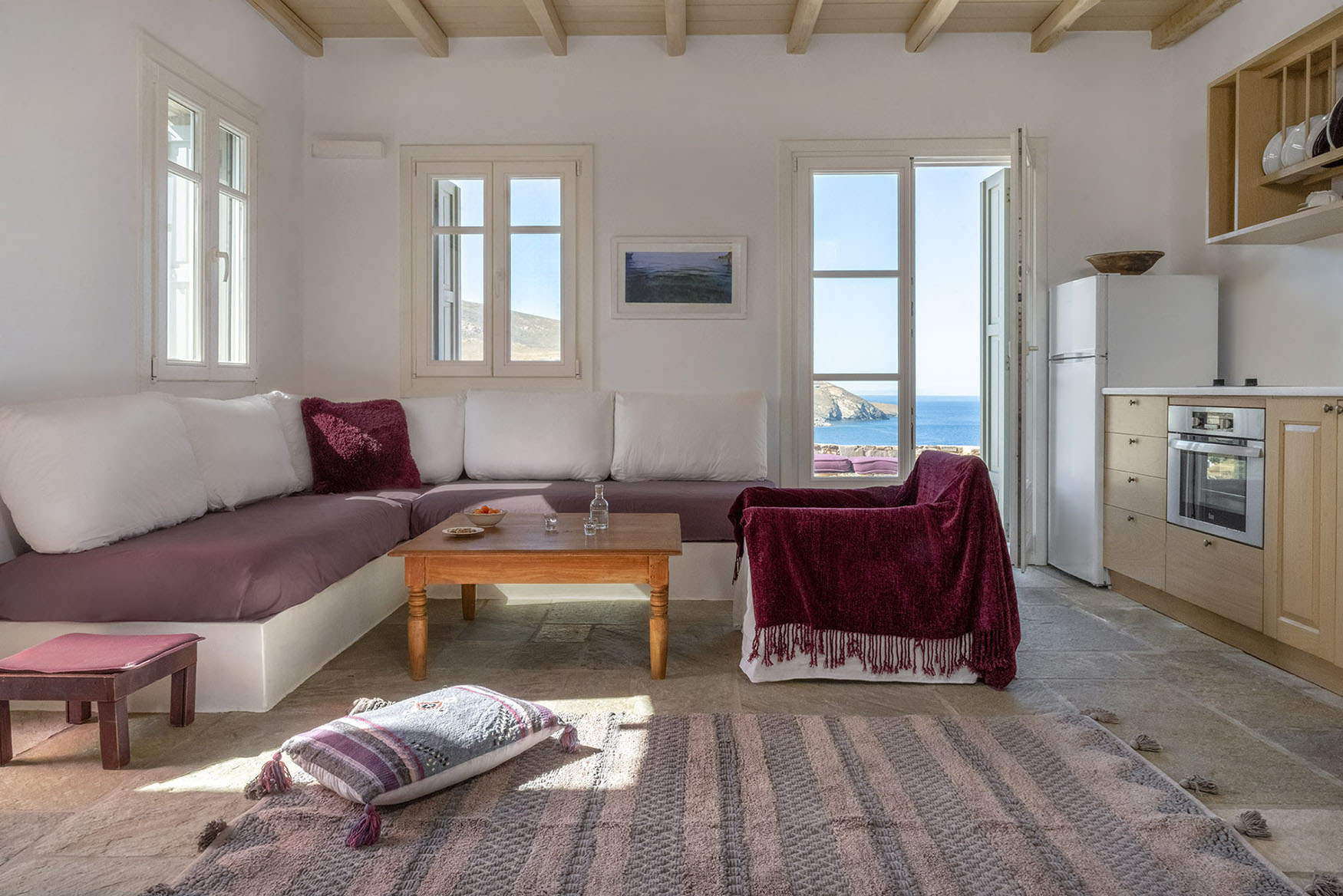 Villa Ammos is charming and convenient with a modern, fully-equipped kitchen, open plan living room area separate bedrooms with ample closet space (one with a double bed, the other with 2 singles that can be joined to create a double.). Top quality mattresses and bedding supports the comfort of your rest time and quality of your sleep. A spacious bathroom with a rainfall shower head. The villa is ideal for 4 people but can accommodate up to 6 comfortably.